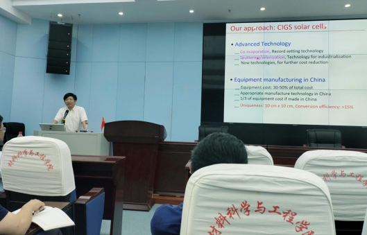 肖旭东教授的报告题目为“Cu(In,Ga)Se2太阳电池的实验室研究开发及其产业化应用”。报告中,肖旭东教授从Cu(In,Ga)Se2(CIGS)太阳电池发展历史出发,讲授了CIGS太阳能电池的应用前景及面临的困难;结合自己课题组在CIGS太阳电池多年来的丰富研究经验,重点讲授了提高CIGS太阳电池光电转换效率的几种策略及其在CIGS产业化过程中遇到的困难和解决方案。肖教授结合具体实例从太阳电池载流子产生、分离和传输微观过程出发,浅显易懂地讲授太阳电池的效率提升方法及其物理机理,使公司师生受益匪浅。公司师生对肖旭东教授的工作十分感兴趣,大家积极提问,肖教授耐心解答。最后,报告会在浓郁的学术氛围和热烈的掌声中结束。