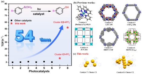 Au(I)配合物具有合适的氧化还原电位,能够选择性地促进多种有机环化反应,例如:光催化氧化还原有机反应。优异的光电特性使得Au(I)配合物有可能发展成为一类理想的光催化剂材料。在目前报道的Au (I)光催化剂体系中,含有单核和双核Au (I/III)活性中心配合物催化剂使用较为普遍,如:Ph3PAuCl和Au2(μ-dppm)2(OTf)2等。然而,关于具有多金属活性位点和丰富电子传输路径的高核Au (I/III)团簇光催化剂的设计、开发以及催化性能研究的报道相对较少。该工作发展了一种高核Au(I)超分子簇合物催化剂的可控自组装方法,其关键在于通过多重亲金作用分级驱动多组分的协同自组装,从而实现簇合物金属核数和聚集结构的精准调控。作者精确合成了两种具有增强光催化活性的高核超分子簇催化剂四核簇合物C1((dppmAu2)2L1]•PF6-)和十六核簇合物C2((dppmAu2)6(Au4)(L1)4]•4PF6-)。两种多核Au (I)簇催化剂在芳基硼酸的羟基化和苄胺氧化偶联方面表现出优异的光催化性能,其中C2簇合物和C1簇合物的TOF分别为52.045 h-1和6.030 h-1,与之前报道的光催化剂相比,如:Ru(II)配合物、共价有机框架(COFs)和金属有机框架(MOFs)等,本文合成的两个多核Au (I)超分子团簇对芳基硼酸的氧化反应表现出最高的光催化效率。与簇合物C1相比,高核簇催化剂C2表现出优越的光催化活性,这是由于C2具有更高的光电灵敏度和更多暴露的金属活性位点。这项研究结果将为高效、绿色、光驱动的有机合成反应多核Au(I)超分子簇催化剂的设计,合成与性能开发提供新的思路和途径。