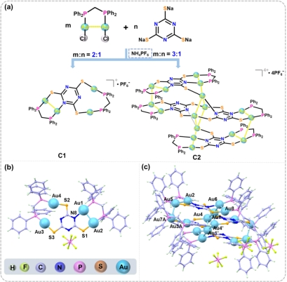 图1,作者采用多组分协同自组装策略精确自组装高核Au(I)超分子簇合物催化剂的制备路径(a)和单晶结构(b-c,平面形四核簇合物C1和梯形十六核簇合物C2)。