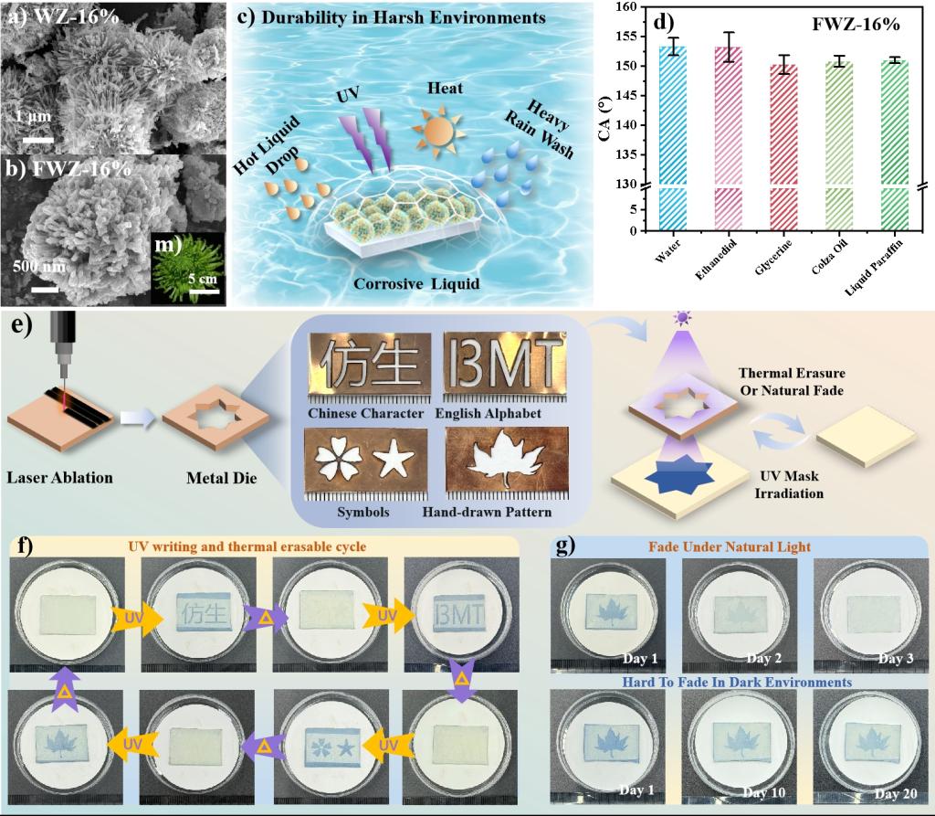 “光致变色”被定义为由光照射引起的可逆颜色变化。更具体地说,它是指化学物质由于电磁辐射而发生两种形态之间的可逆转变,在光学信息存储和传输、化学传感器和可重写系统中具有应用。然而,目前的光致变色材料面临着成本高、毒性大、着色慢、效率低、耐久性差等挑战,阻碍了其实际应用。此外,信息的安全存储和传输也是人们关心的问题。无机光致变色材料具有亲水性,很容易受到水或油污染而失效,对长期信息存储构成威胁并限制了光致变色材料的实际应用。在这项工作中,团队提出了利用水热和氟化技术的制备氧化钨基超双疏光致变色材料,以改善光致变色响应速率和信息传输的安全性。与块体材料相比,纳米结构材料具有更大的界面面积和更短的载流子扩散距离,从而促进光生载流子的分离和转移。微/纳米结构提供相对较大的表面积,为附着在表面上的物质提供较短的离子扩散长度。同时,表面水解缩合的氟硅烷作为有机聚合物,作为有效的电子供体,而残留的H+和H2O分子为快速电子-质子插入WO3。值得注意的是,与其他ZnO含量的FWZ 表面相比,FWZ-16%涂层的褪色时间最短,这归因于其更对称的花状层次结构增强了光致变色性能。此外,涂层变色和未变色部分均能够抵抗水和菜籽油等液体,解决了氧化钨基光致变色材料在信息在存储和传输时的遇到水和油污信息失效的问题,提高了其使用寿命。以上工作得到了国家自然科学基金重点项目和湖北省创新团队项目的支持。