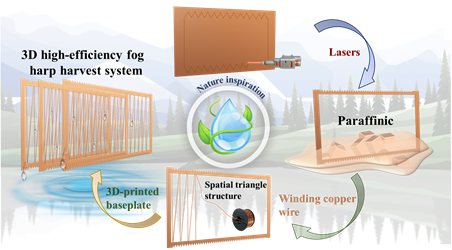 随着全球气候变化和能源消耗增加,全球淡水资源短缺现象日趋严重。如何高效、快捷地获取淡水已成为人类面临的主要挑战之一。在这一背景下,大气水作为水资源的一个潜在来源引起了广泛关注。为此,仿生竖琴集雾器因其出色的集雾率而备受关注。然而,最近的研究主要集中于捕获雾气的钢丝材料的特性上,而忽略了框架在水分输送中的集成作用。这种忽略可能导致雾水收集的整体效率降低,还会引发水传输中的挑战,如水桥的形成和缠结现象。针对这一问题,该研究团队开发了一种基于多生物雾收集原理的新型三维雾收集系统。该设计具有竖琴状结构,受仙人掌和蜘蛛丝中拉普拉斯压差的启发,利用交叉缠绕的铜丝在空间上呈三角形排列,加速水桥的运动。此外,借鉴猪笼草和蓝莓表面的滑移表面,研究团队在铜板框架上涂敷石蜡涂层,形成坚固的滑移框架,提高了丝捕获和框架输送之间的协同效应。实验结果表明,单片式集雾器在100分钟内的集水量稳步提升,且在连续的十次雾收集中数据仅出现小范围内的波动,展现出卓越的耐久性。将单片式集雾器集成到三维的雾收集系统中,可实现0.5027 g cm-2min-1的高效雾收集率。由于其耐用性、简便性和环保性,该系统在实际应用中具有广阔的发展前景。