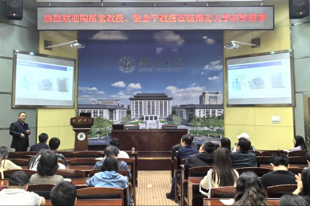 在本次报告中陶绪堂教授详细分享了其团队在人工晶体材料研究领域取得的丰富创新成果。陶教授首先从天然晶体到人工晶体的演进引入,接着从不同维度代表性晶体材料出发,阐述了我国有关超宽禁带半导体单晶、有机-无机复合钙钛矿晶体、非线性光学晶体、单晶光纤等的研究历程、主要进展及其团队的重要创新成果。考虑到宽禁带半导体材料与器件研究中心工作实际,陶教授着重比较了β-Ga2O3单晶生长几种常用工艺的优劣,并分享了其团队在“导模法”生长β-Ga2O3单晶研究方面的实践经验和最新进展。陶绪堂教授报告深入浅出,令师生们受益良多。会后师生们踊跃提问,陶教授耐心解答提问,大家讨论积极热烈。最后,学术报告会在浓郁的学术氛围和热烈的掌声中圆满结束。