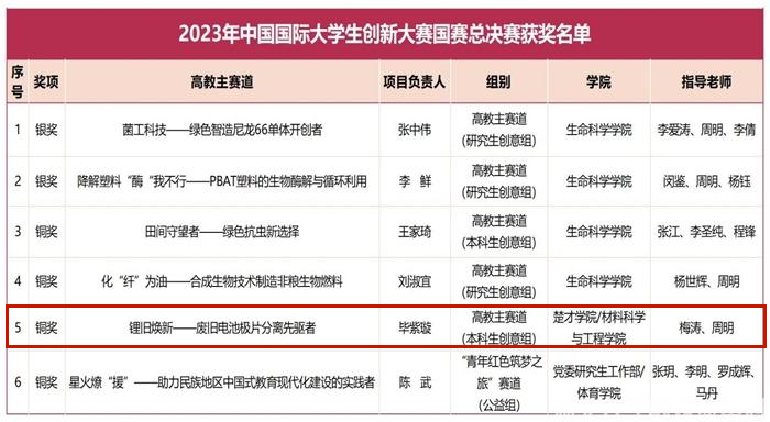 “锂旧焕新——废旧电池极片分离先驱者”项目由梅涛、周明两位老师共同指导,williamhill英国官网、商公司、新闻传播公司共10名员工组成,其中公司毕紫璇同学担任负责人。项目团队历时3年,从入围校内第一批重点培育项目,到通过校赛、省赛,乃至进入国赛,一路披荆斩棘、过关斩将。