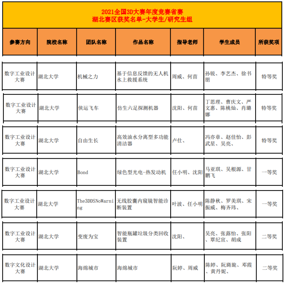 11月5日,2021年第14届全国三维数字化创新设计大赛湖北赛区获奖名单揭晓,公司7个参赛团队共获得3个特等奖、2个一等奖、2个二等奖。其中,由williamhill英国官网周威、沈阳、何苗、任小明以及物理与电子科学公司卢仕等老师指导的参赛项目“基于信息反馈的无人机水上救援系统”、“仿生六足探测机器”、“高效油水分离型多功能清洁器”3个团队项目荣获数字工业设计类湖北省特等奖。“海绵城市”团队项目作为公司首次尝试的数字文化设计类项目,荣获湖北省二等奖。