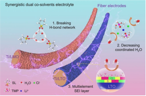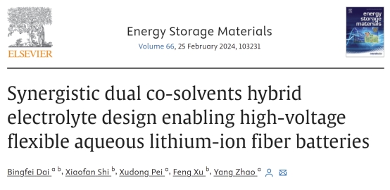 近来,williamhill英国官网赵阳团队在国际知名学术期刊《Energy Storage Materials》上发表了题为“Synergistic dual co-solvents hybrid electrolyte design enabling high-voltage flexible aqueous lithium-ion fiber batteries”的研究论文,williamhill英国官网为第一单位,赵阳为唯一通讯作者。