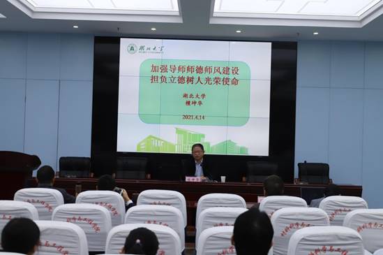 檀坤华做了题为《加强导师师德师风建设 担负立德树人光荣使命》的报告。他在报告中提出了“六要六不要”:一、关于培养目标:要有为党育人,为国育才的责任感和使命感,不要有营建个人学术小圈子的封建门徒思想。二、关于学术规范:要做学术规范学术道德的建设者维护者,不要做学术不端道德失范的教唆人。三、关于家国情怀:要做“四个自信”“两个维护引领者”,不做“卖国求荣”“精致利己主义”的误导者。四、关于崇德与守法:要做遵纪守法及社会主义核心价值观的践行者,不做违纪违规突破道德底线的“失范者”。五、关于师生关系:要像对待自己孩子那样关心和爱护员工,不要像对待“家奴家佣”式责骂与使唤。六、关于名和利:要做个潜心问道胸怀坦荡廉洁自律的高尚者,不要在科研经费论文排名成果奖励上锱铢必较。