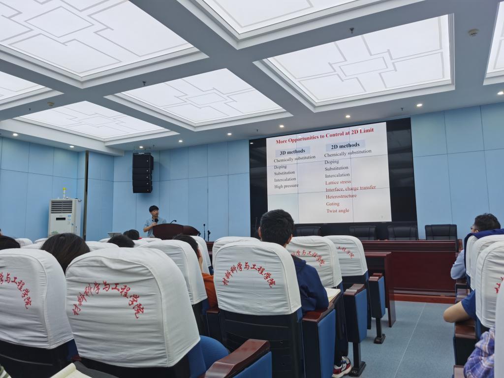 报告中,李教授首先阐述了分子束外延(MBE)、扫描隧道谱(STS)、准粒子干涉技术(QPI)的背景知识,接着重点论述了他课题组利用这些技术在探明单层WTe2的半金属能带结构、CoSi的手性费米弧表面态,以及双层TiSe2的电子-玻色耦合重整能带等方面的研究结果。李教授的报告深入浅出,向参会师生清楚展示了他课题组近期在量子材料前沿领域的研究进展。此外,李教授耐心解答了参会师生的提问,大家积极讨论。最后,学术报告会在浓郁的学术氛围和热烈的掌声中结束。