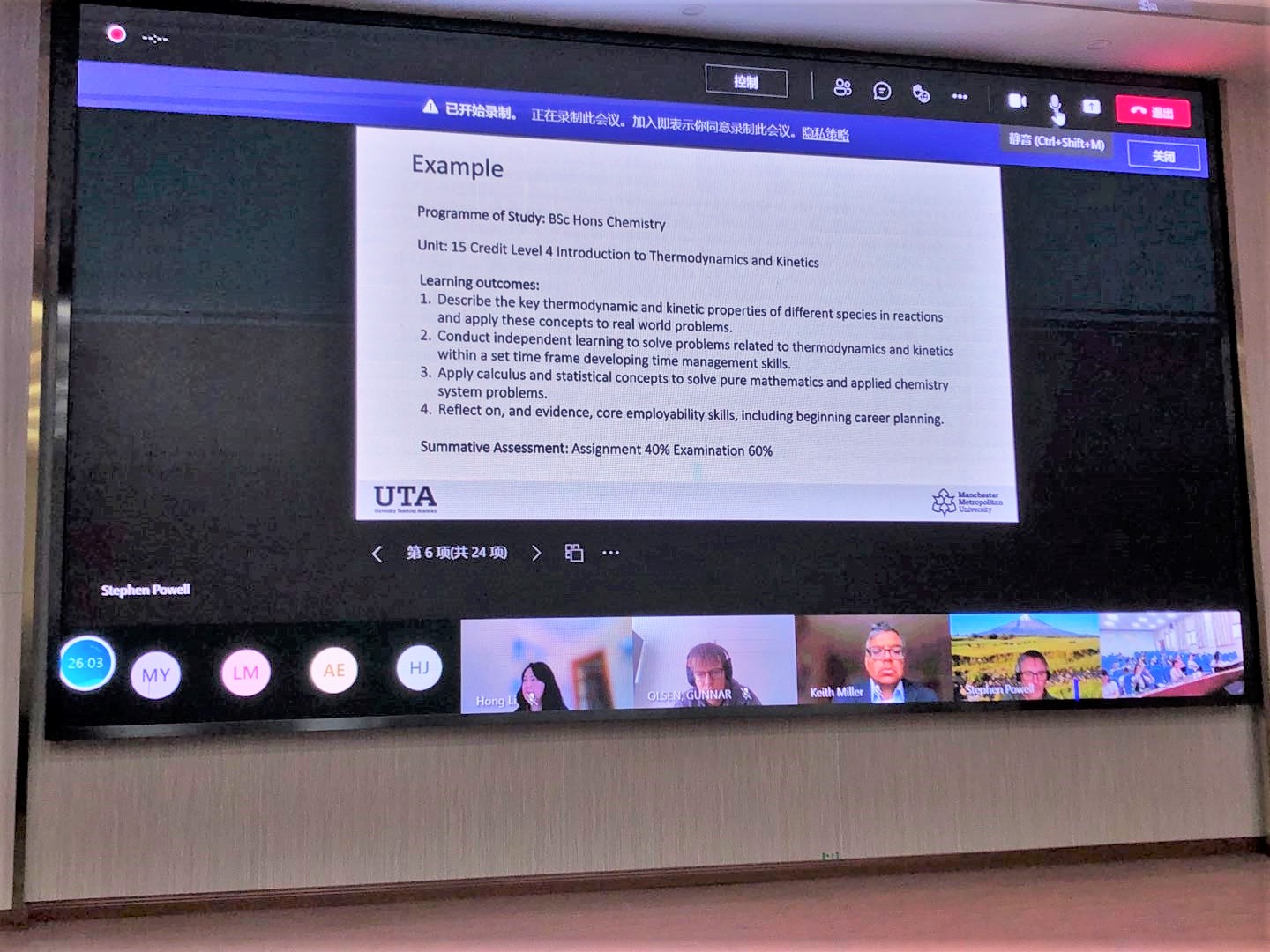 5月25日下午,材料化学中外合作办学教师参加williamhill英国官网曼城联合公司教学研讨会。本次活动由湖大曼城联合公司主办,会议于湖大曼城联合公司三楼报告厅召开,采用视频会议的方式进行。会议听取了英国曼彻斯特城市大学理工学部副部长Keith Miller教授和Stephen Powell教授的报告,双方老师就两校在教学管理、教学设计、员工反馈等各方面的操作流程、管理规范、评价方式等进行了深入的交流。