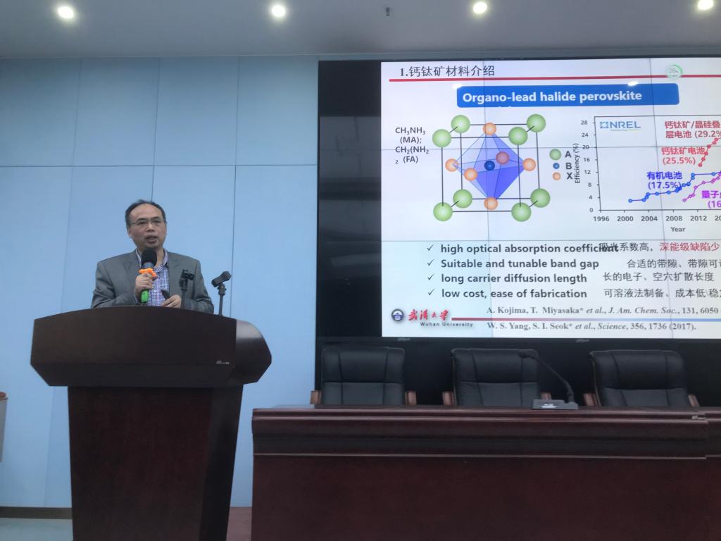 报告中,方国家教授首先向大家介绍了有机无机杂化钙钛矿材料的特点、钙钛矿太阳能电池获得优异性能的前提条件,然后重点报告了他课题组在以SnO2薄膜和量子点作为电子传输层制备钙钛矿太阳能电池方面取得的重要成果和最新进展,接着方教授介绍了他课题组最近在钙钛矿材料发光及钙钛矿单晶应用于X射线探测方面的工作,最后方教授就国家自然科学基金申报方面需要注意的问题与在场老师进行了沟通交流。方教授的报告引起了与会老师和同学们的极大兴趣,双方展开了热烈讨论。最后,报告会在浓郁的学术氛围和热烈的掌声中结束。