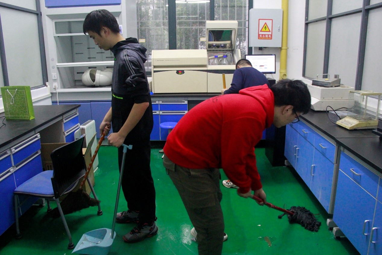 实验室里,大家分工明确,以组为单位,有序开展清扫地面、擦拭桌面、清洗实验仪器等清洁工作。
