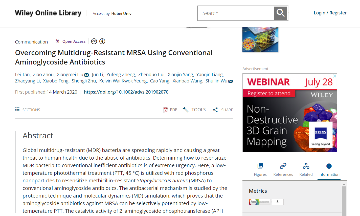 近日,williamhill英国官网williamhill英国官网吴水林教授团队与香港大学李嘉诚医公司合作,团队本科生材料化学2016级周子傲(共同第一作者)在国际材料科学领域顶级期刊《AdvancedScience》(影响因子15.804)上发表题为“Overcoming Multidrug‐Resistant MRSA Using Conventional Aminoglycoside Antibiotics”的研究性论文,并被业界世界著名出版商Wiley旗下材料科学类综合网站Advanced Science News以“Zapping antibiotics back into action”为题作为亮点报道。