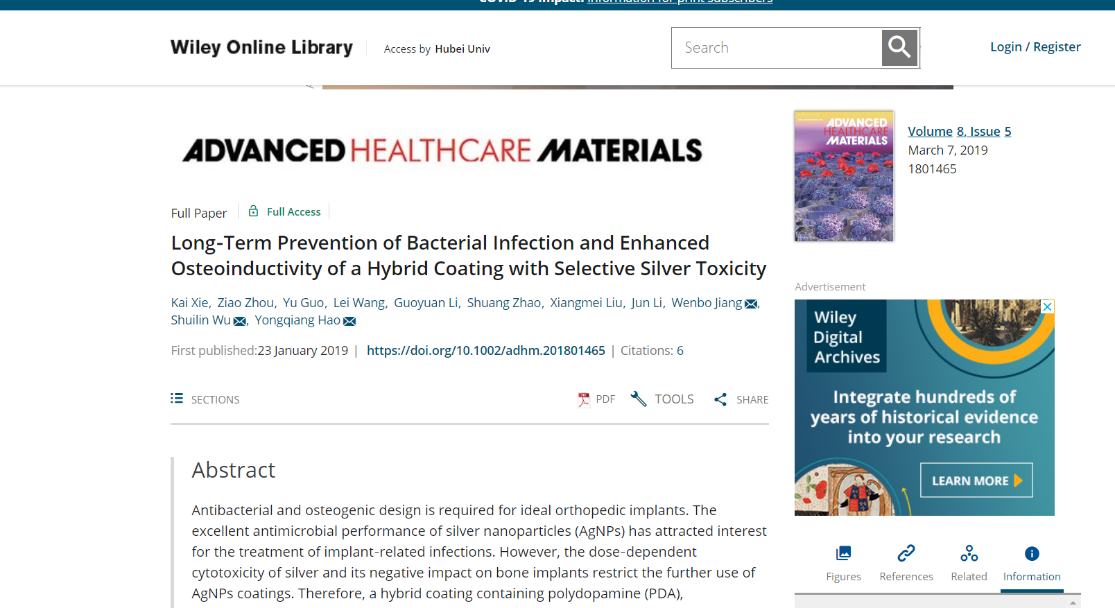 近日,williamhill英国官网williamhill英国官网吴水林教授课题组与上海交通大学第九人民附属医院合作,课题组成员2016级本科生周子傲(共同第一作者)在国际材料科学领域著名期刊《Advanced healthcare Materials》(影响因子6.24)上发表题为“Long-Term Prevention of Bacterial Infection and Enhanced Osteoinductivity of a Hybrid Coating with Selective Silver Toxicity”的研究性论文,并被Advanced healthcare Materials期刊作为热点文章以封面的形式刊出。