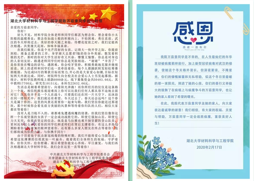 “茹意,最美好的年华,应该灿若星辰,相信万茹意同学可以战胜病魔,如意地早日回到校园。最美的湖大在等你!最好的湖大师生在等你!”这是师生们对她的祝愿!