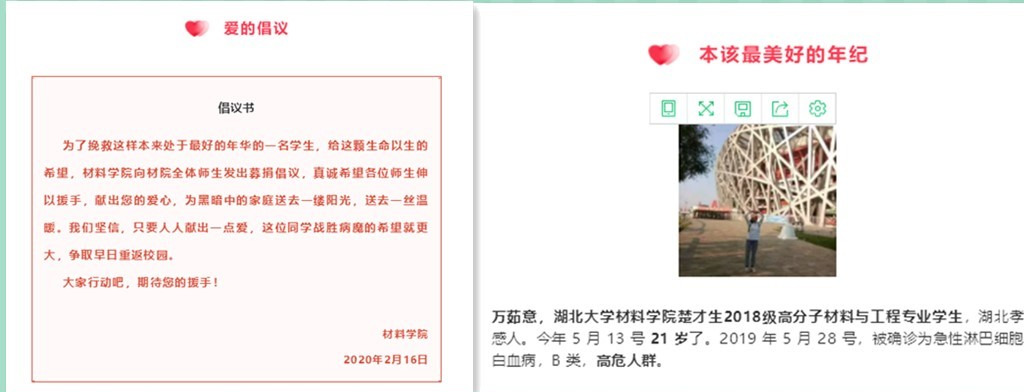 “爱的倡议,请为材院楚才生万茹意撑开一束光……”2月16日,一条紧急倡议书在williamhill英国官网小助手里推送发出。2018级高分子材料与工程专业楚才生万茹意因急性淋巴细胞白血病复发,病情危急,急需救治。但时值疫情特殊时期,救治之路困难重重,公司党委以爱和希望为名,向williamhill英国官网全体师生发起捐助倡议。