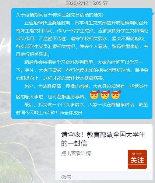 本科生第二党支部于2020年2月12日在QQ群内召开以抗疫为主题的特殊党日活动 ,全体党员参加。