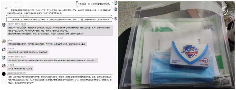 党日活动,全体党员参加。首先,代理党支书李涤非介绍疫情相关情况。其次,支部同志发表个人看法,其中熊心月同志讲到:“村长往家里打过电话,武汉回来的都要登记,而且不能出门,还有人上门测过体温。登记人员都发放了相关防疫物品,如图,是一大袋板蓝根,体温计,记录手册,肥皂,还有两个医用口罩。”