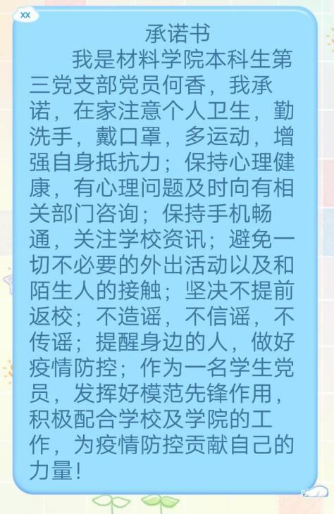 我承诺,在家注意个人卫生,勤洗手,戴口罩,多运动,增强自身抵抗力;保持心理健康,有心理问题及时提出;保持手机畅通,关注公司资讯;避免一切不重要的外出活动以及和陌生人的接触;坚决不提前返校;不造谣,不信谣,不传谣;提醒身边的人,做好疫情防控,保护好身边的人;作为一名员工党员,一定发挥好模范先锋作用,随时准备积极配合公司公司的工作安排,为疫情防控贡献自己的力量!待春暖花开,相聚湖大!