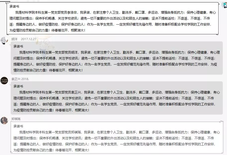 本次线上活动中,第四党支部党员在线上做出承诺,积极配合防疫要求,互相交流了对于本次疫情的相关看法,并以文稿形式总结了此次疫情期间自己的心理状态,身体健康和生活规律,并简单陈述了自己的一些看法。